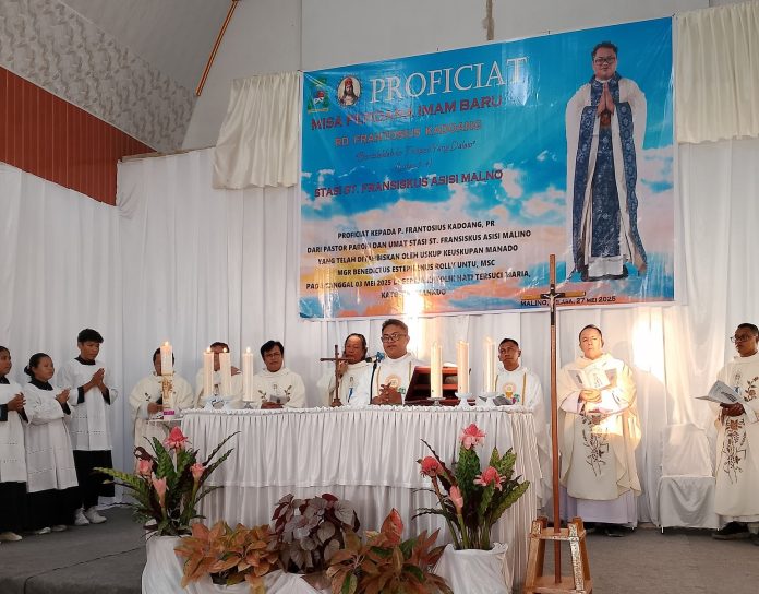 Banggai – Pada hari Selasa (27/5/2025), rangkaian perayaan Misa Perdana Imam Baru RD Frantosius Kadoang dilaksanakan dengan meriah. Rangkaian perayaan ini dimulai dengan acara penyambutan pada pukul 15.00 WITA dan diakhiri dengan acara ramah tamah.